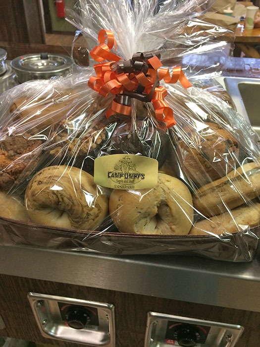 - Large – 15 Bagels, 4 Muffins, 2 Cream Cheese, Butter, White Lake Whopper & Bagel Chips * *when available